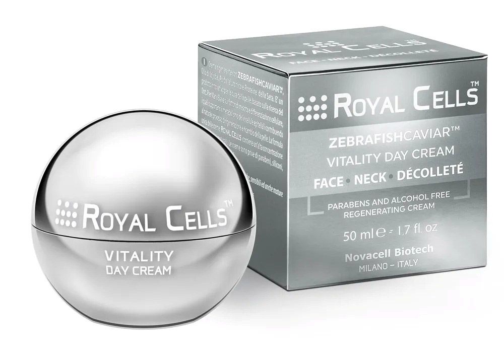 A ROYAL CELLS Vitality Day Cream hidratáló és regeneráló krém, amely ROE EXTRACT-ot, jojobaolajat, hialuronsavat és selyemfehérjéket tartalmaz.